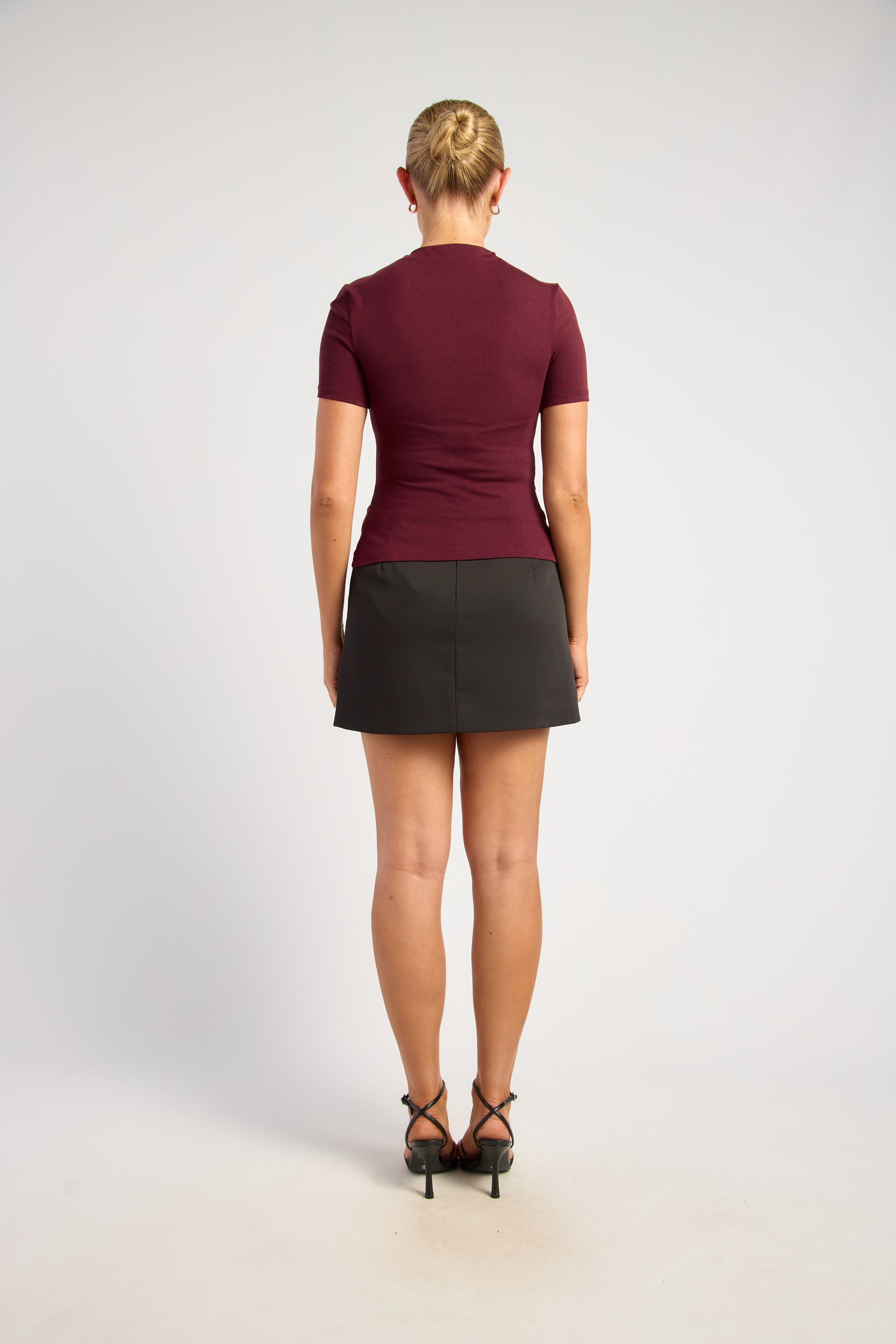 The higher neckline creates a sleek, modern shape, while the waist-length cut makes it perfect for pairing with high-rise denim, tailored trousers, or skirts. Short sleeves keep the look balanced and versatile for year-round styling. The standout detail? A subtle cinched accent finished with a gold pin, adding just the right touch of structure and sophistication.