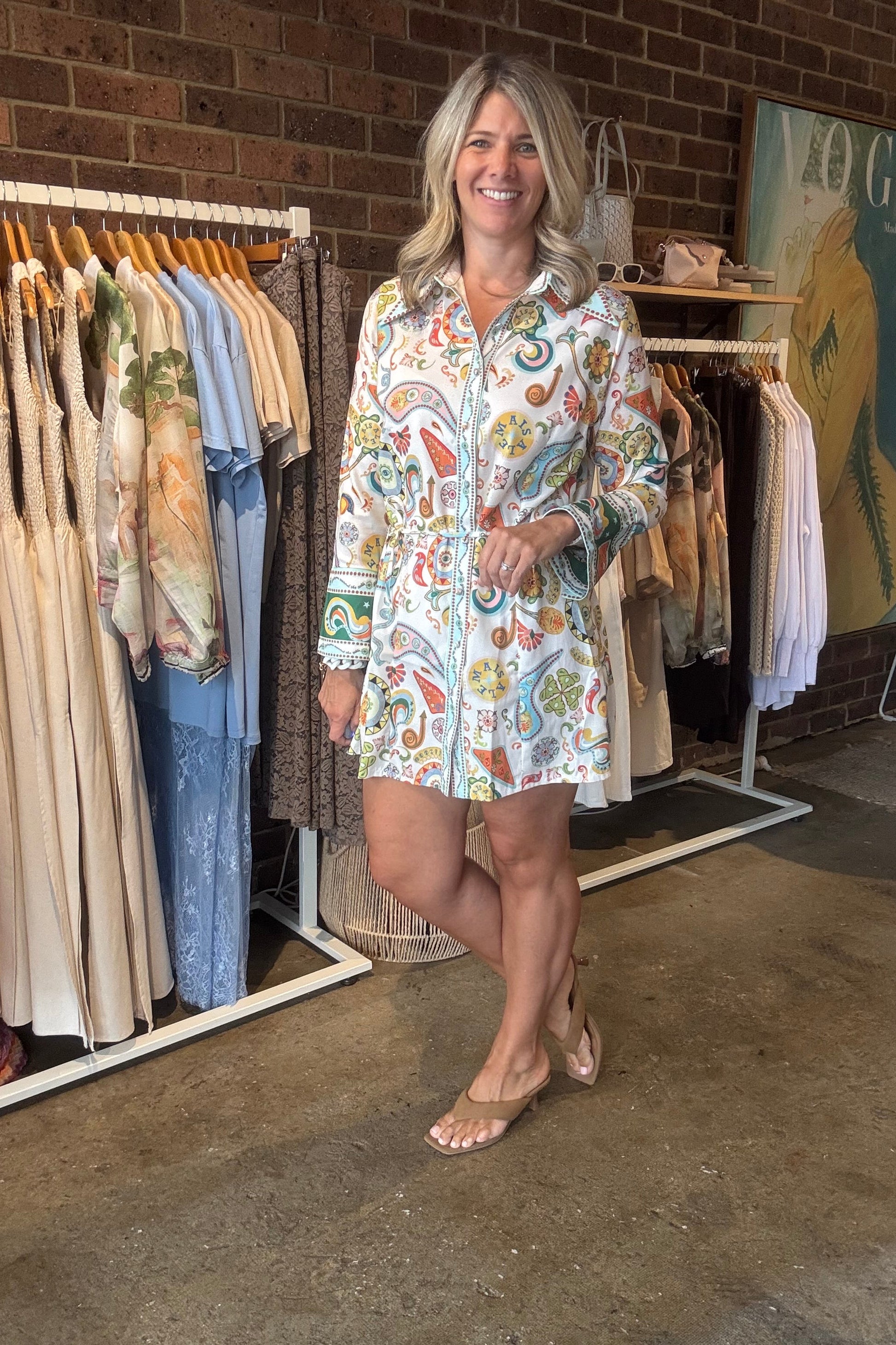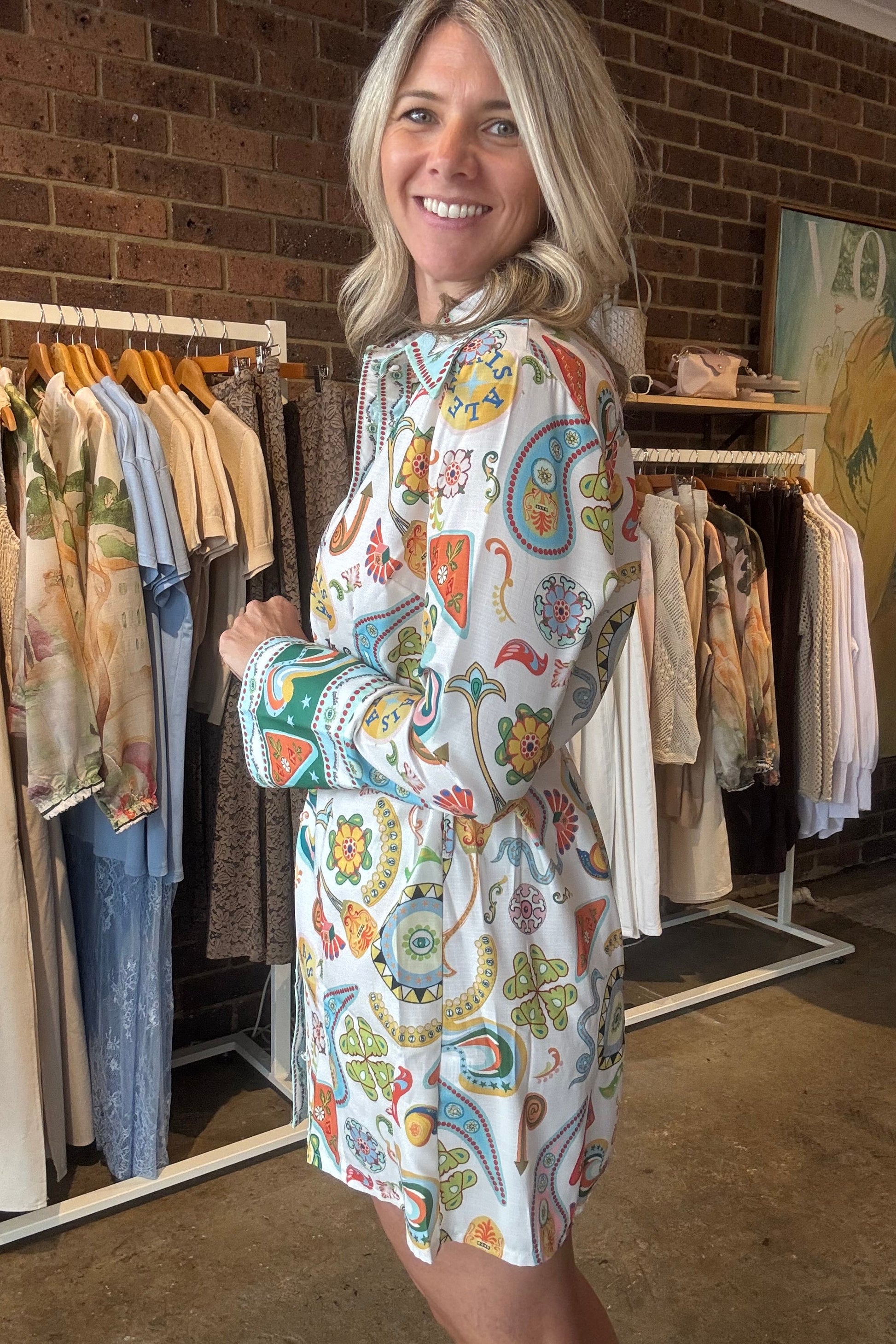 Featuring a stunning pattern in vibrant greens, blues, yellows, and oranges, this dress brings colour and movement to your wardrobe. Perfect for workdays, weekend brunch, or special outings, it’s a versatile piece that makes a statement with ease.