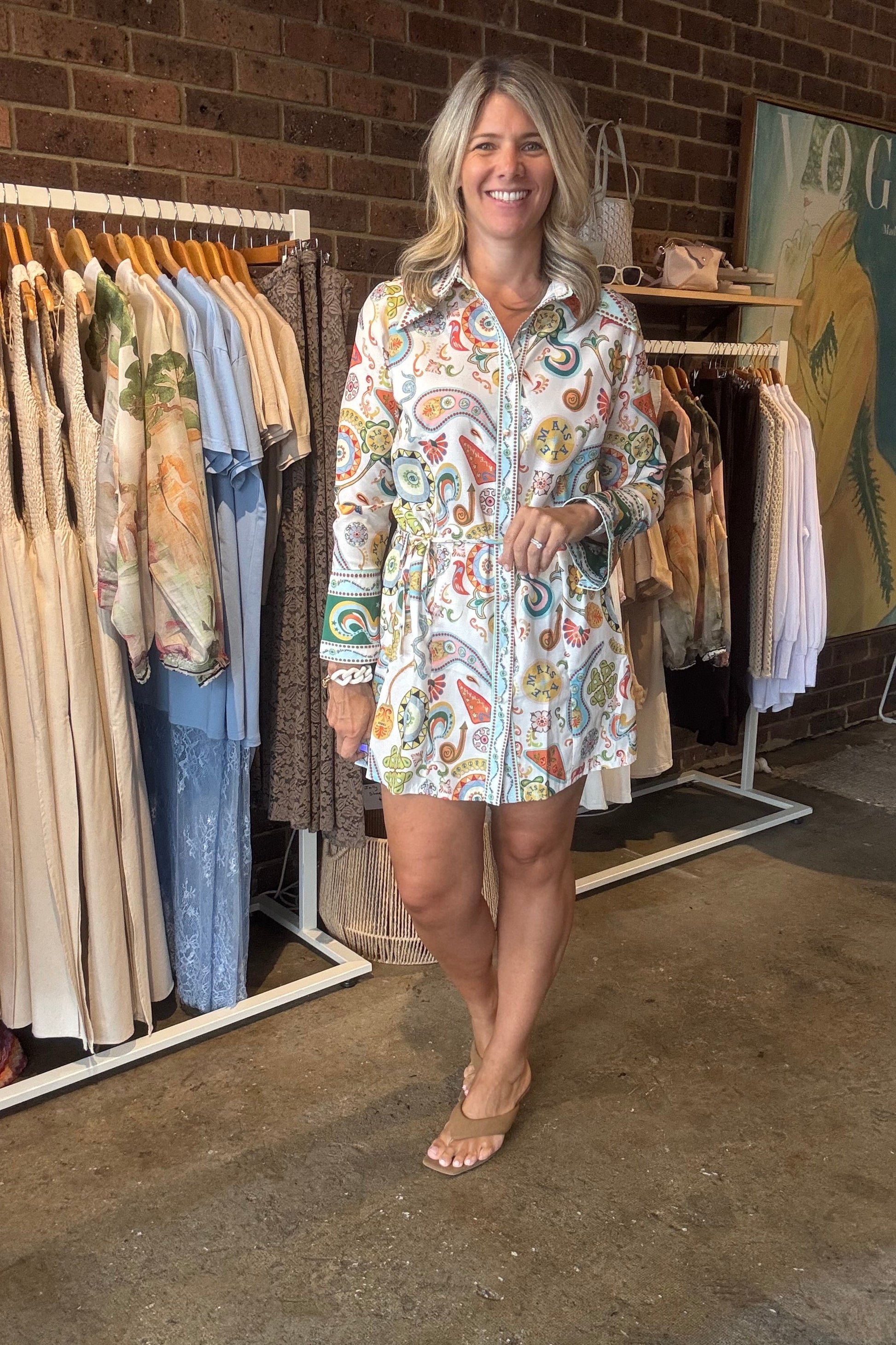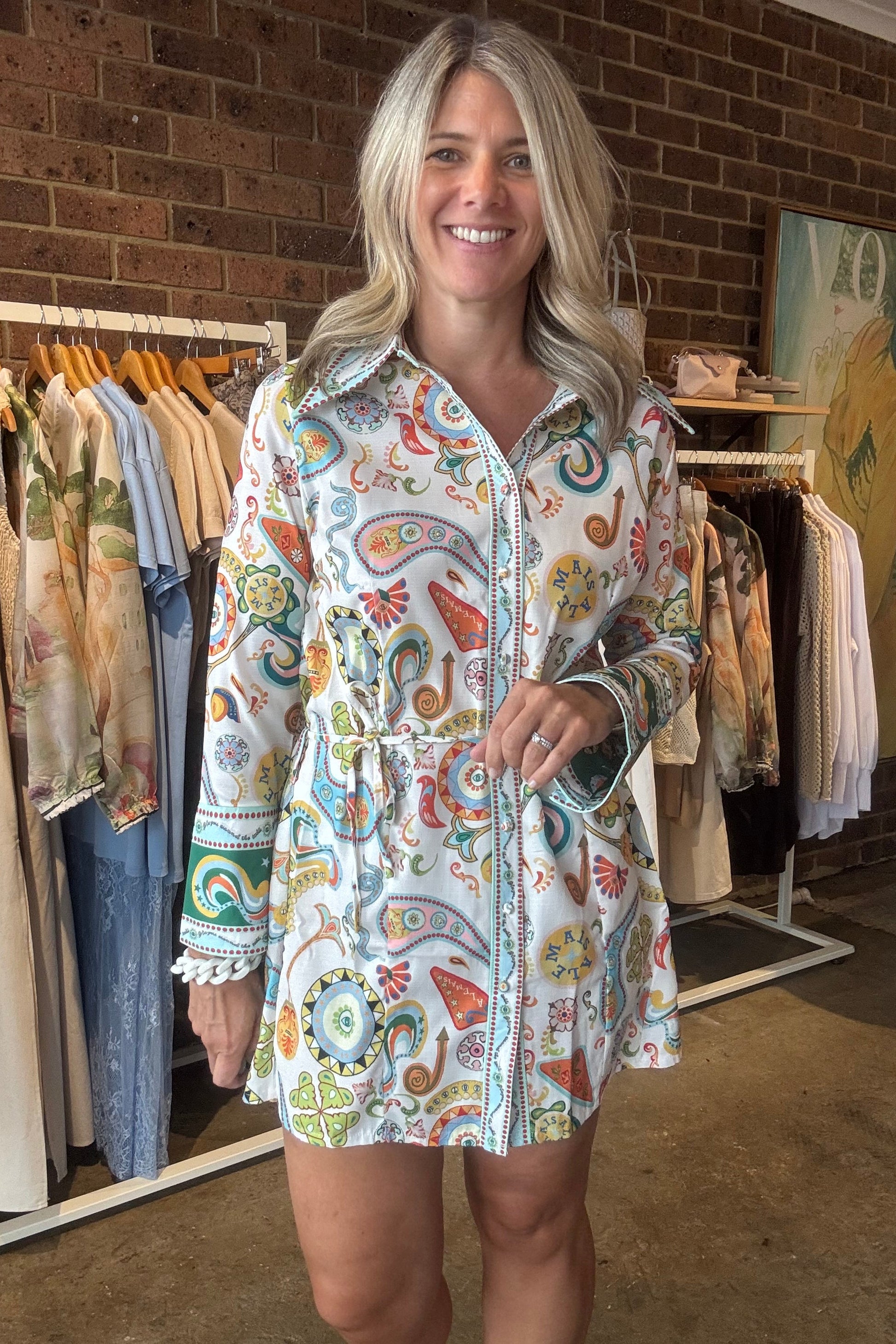 Elevate your everyday style with this effortlessly polished long sleeve dress. Designed with a classic pointed shirt collar and full button-through front, it blends timeless tailoring with an easy, feminine silhouette. The slightly wide cuffs with delicate button details add a refined touch, while the adjustable waist tie cinches you in for a flattering, customizable fit.