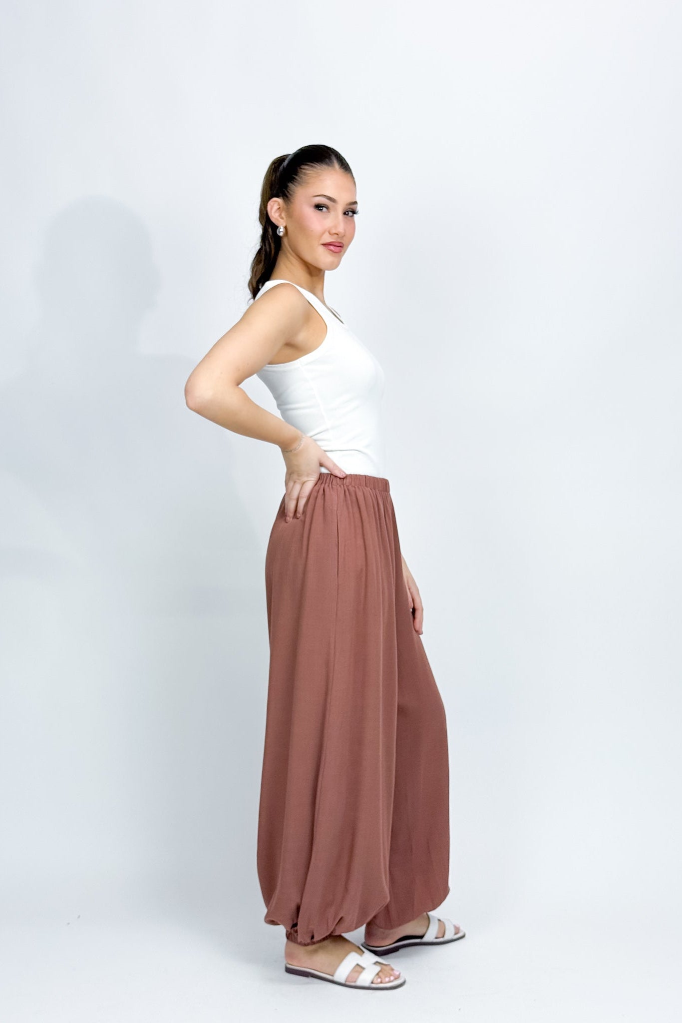 Designed for ultimate comfort without compromising on style, these light brown genie pants are your new go-to for relaxed days. Featuring a loose, flowy silhouette, they move effortlessly with you while delivering a laid-back, modern look.