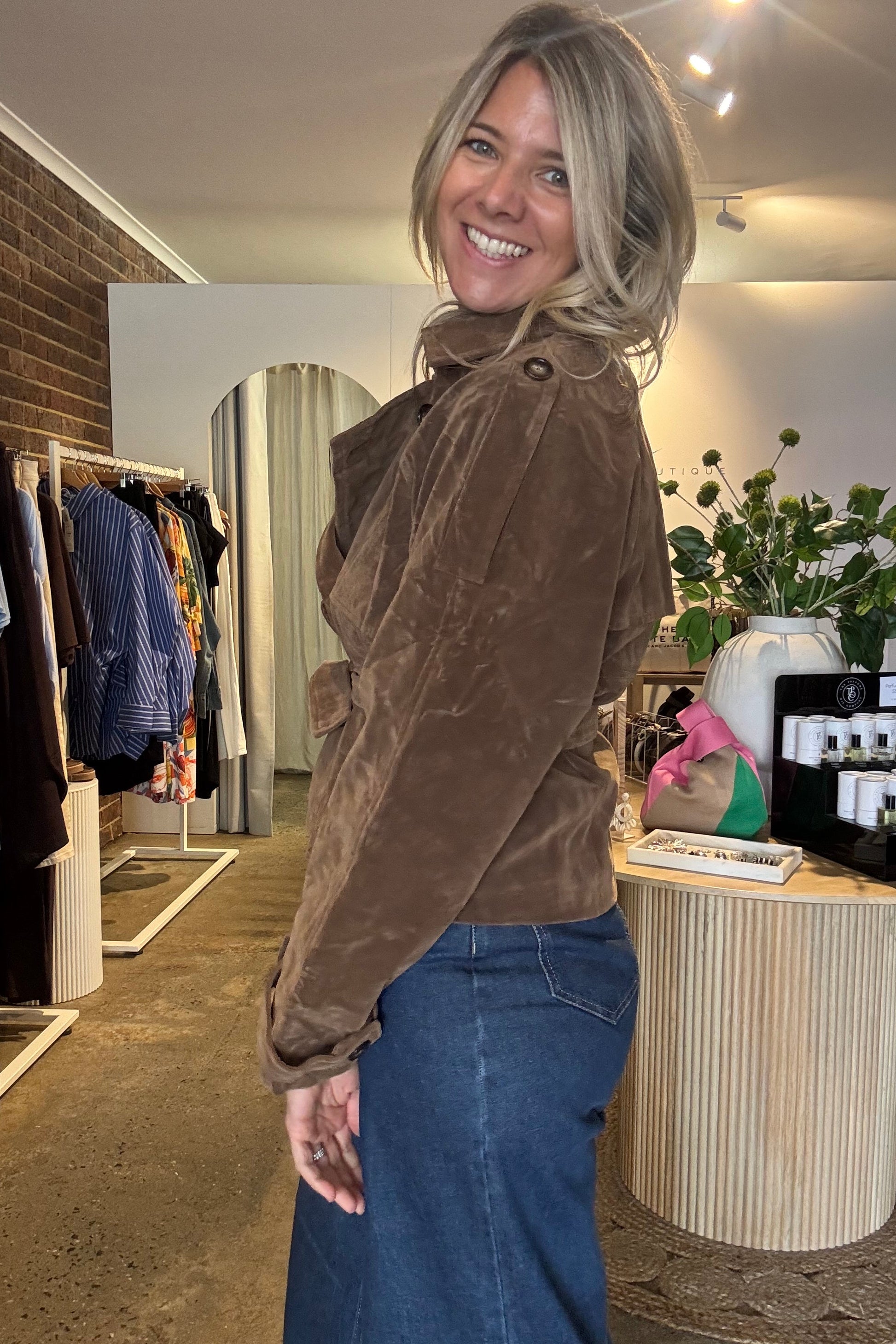 Elevate your outerwear game with our Suede-Look Cropped Trench Jacket — a modern twist on the timeless trench silhouette. Designed to bring effortless polish to any outfit, this jacket blends classic trench detailing with a contemporary cropped cut for a look that’s both refined and fashion-forward.
