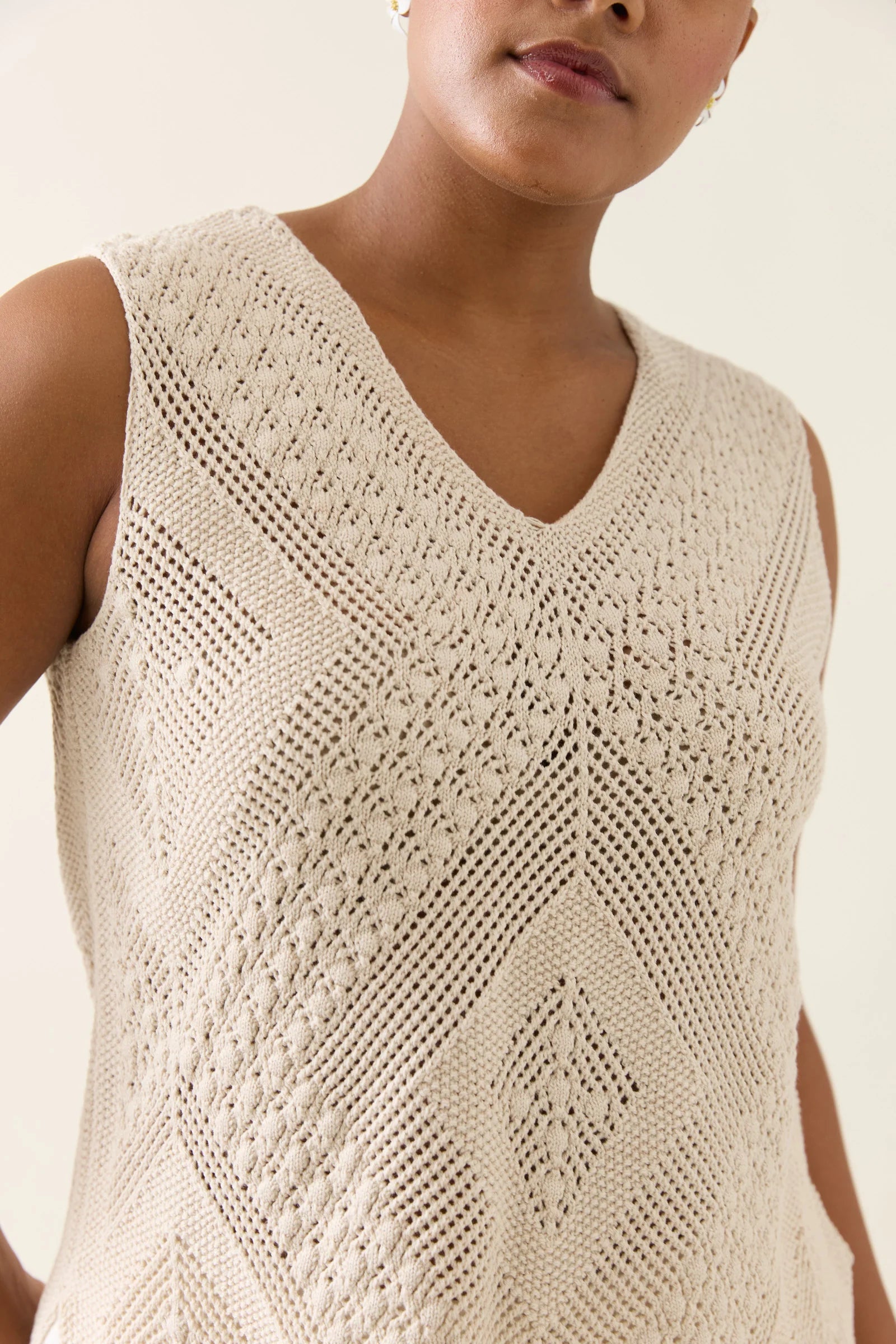 The Sylvie Top is a sleeveless knit with subtle texture and a flattering V-neckline. With a side split hem and diamond pattern finish, it blends structure with softness.